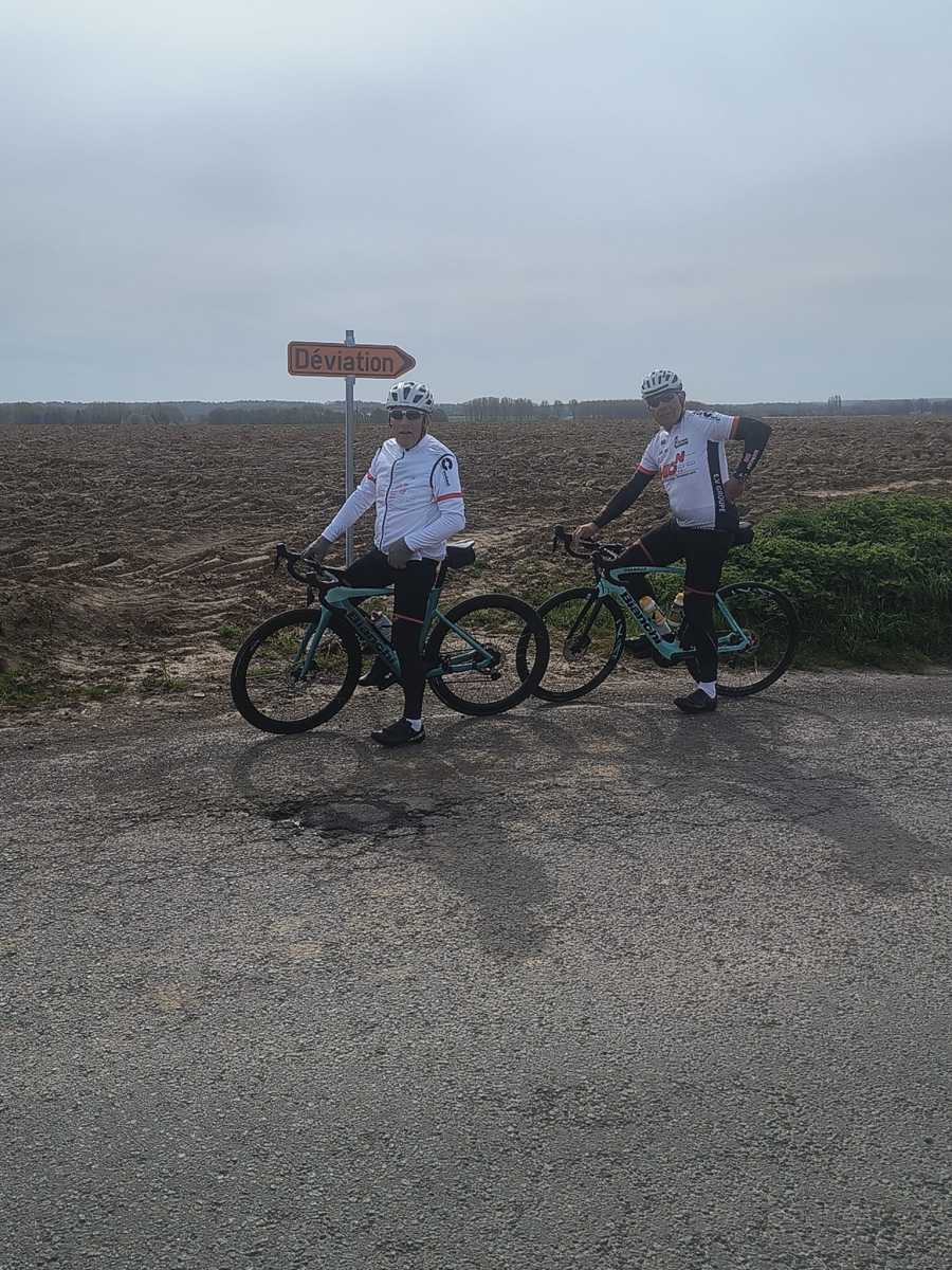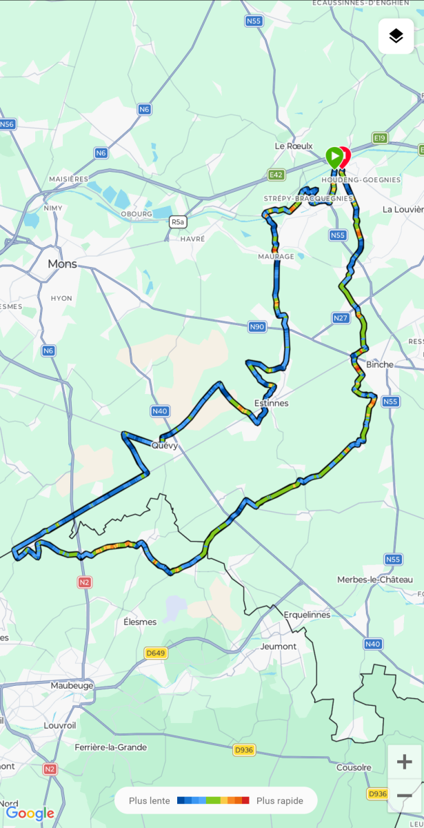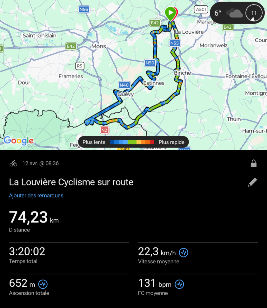 C’est par un temps frais que le groupe a pris la direction de la France via quelques petites côtes dont le capitaine Michel et son lieutenant Bernard ont le secret: le bois de Breucq, les éoliennes d’Estinnes pour enfin arriver du côté de Bettignies et ensuite Sire Nicole. Le retour se fera par Waudrez, Péronnes pour finir en fanfare par la côte de Saint-Vaast, Bois-du-Luc. Au final +/-75 kms et environ 650m de dénivelés positif. Une ambiance conviviale entre une bonne bande d’amis.